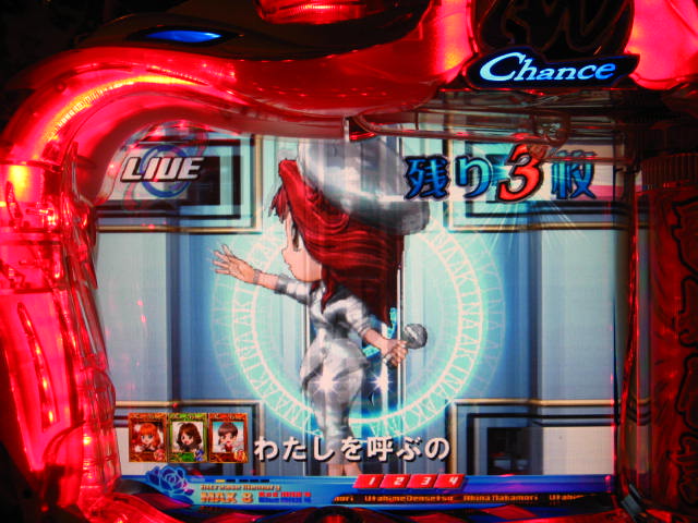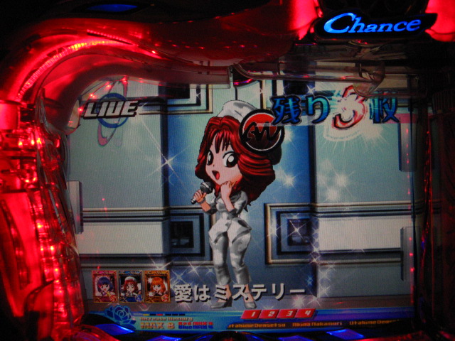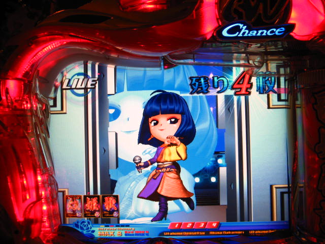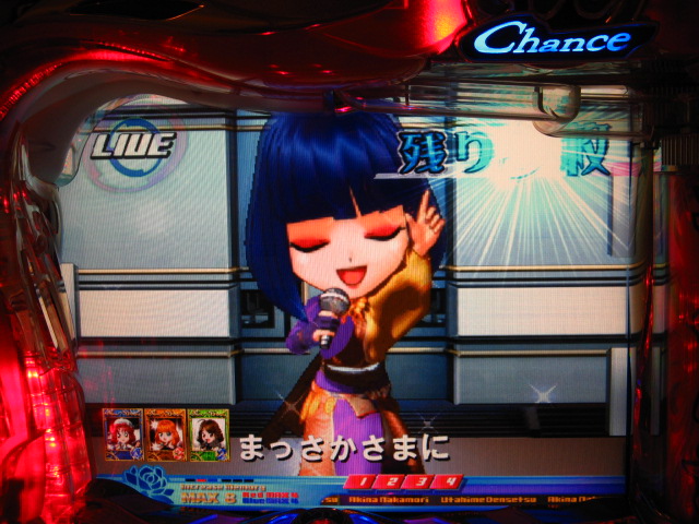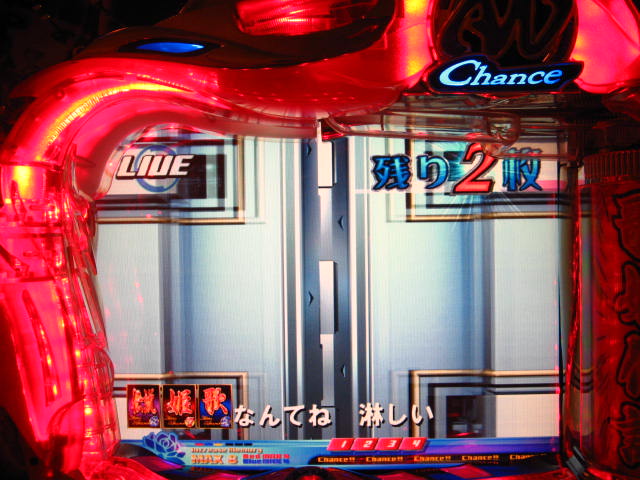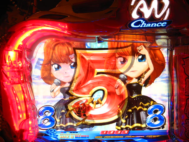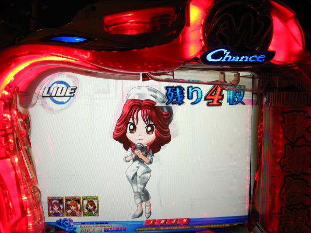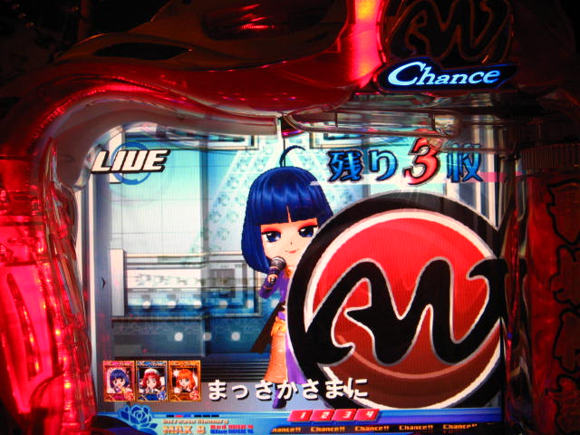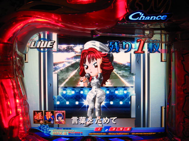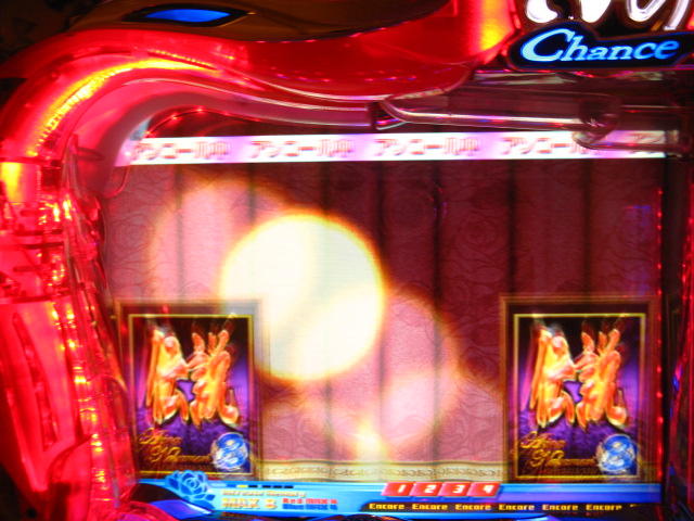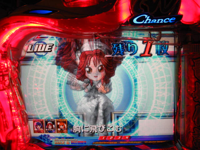 さっそくご相談なんですが・・・ スーパー歌姫モードの時なんですが (もちろんガセです ( ゜з゜):;*.':;) だいぶ前に、通常回転してるとき(カードが透けてる時)に、 カードをつきぬけて(?)ステージライトの丸い光が 通り抜けていくと、リーチ演出だ! ということに気づいたんです。 家パチだとつねに保留が満なので、 変動時間が長ければ ”なんか来る!” とすぐわかるわけですが・・・ まあ、回転が始まると同時に丸い光が左から右へ流れて行くので ”おっ!?” と、イチ早くわかるぐらいのお得感だったんですね。 ちょうどLMの時に、歌が始まる場合はうしろのモニターに ANが流れていくのと同じ感覚です。 ところがっ! CXを打っていたときにスーパー歌姫モードになり ナニゲに画面を見てたら・・・ しょっちゅう丸い光が流れていくんです。 でも、リーチにはならず・・・ その時は、「AXだけ!?そんなわけないよなあ~」とおもいつつ、 家パチ時に見間違えたのかなあ~と思ってました。 で、こないだホールAXを打った時も、スーパー歌姫モードになり 観察してたら・・・ やっぱり、リーチになろうがなるまいがしょっちゅう光が流れます。 やっぱり見間違いか・・・とおもいつつ、微妙に気になってまして。 それからなかなかチャンスがなかったんですが 今日無事にS歌姫モードゲット! で、よぉぉぉぉぉぉく見てたんですけど・・・ やっぱり、なんもないときは光が流れず、 演出が起こる回転と同時に、丸い光が左から右へっ!!! ぜったいに間違いないです! う~~~ん・・・でも、なんでホールではならないんでしょう??? 保留数が関係してるのでしょうか? 皆さんのホール、実機ではいかがでしょう・・・ 親切な方、検証にご協力お願いします・・・ ↓↓↓ってことで、家LIVEですっ!↓↓↓ 2007.05.08 Tue 12:30:32