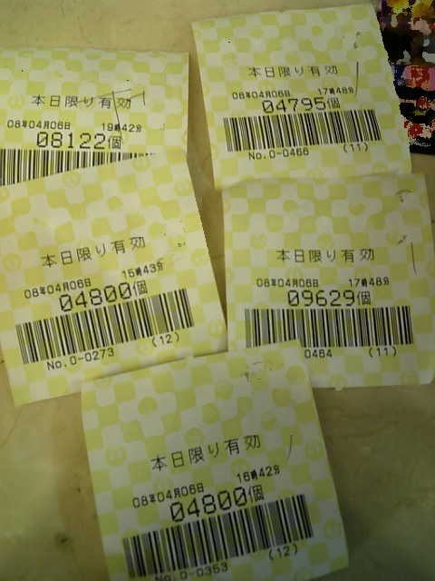 このたびは「春の乱れ打ち完走パン祭り」にご参加くださいまして ほんとうにありがとうございました!!! 冬ソナ2の導入とかと重なり、 きびしい立ち回りになってしまわれた方もいらっしゃるかも… 皆さま全員よりご報告をいただきましたので、 順位が確定いたしました! で、えーと、私の結果です… 優勝しちゃうかもーーー! (`ノ∇´)オーーーッホホホホッ とかエラそうに言っちゃってすいませんでした… 32,146玉でございます! うーーーむ… やっぱし優勝はムリだったか… ァ '`,、'`,、'`,、'`,、(´▽`) '`,、'`,、'`,、'`,、'`,、 6日出陣の結果でございます。 ってか、結局提出できるようなレシートは この日のみでした。(´゚艸゚)ブッ レシート5枚ですが、こちらではほとんどのホールで10箱以上積めないんですね~ 足元に9箱、手元に1箱が限界で、それを超えるとホールに没収されます。 っていうのはもちろんうそです。(あ、そう) 11箱になると1箱ぶんを、12箱になると2箱ぶんを店員さんがそのつど流します。 で、この日はコウダさんで16箱ぐらい、GOさんで5箱ぐらい(すでに記憶ナシ) ゲットいたしましたぁぁぁぁんっ♪ …しかしその後、85K負けたのは記憶にあたらしいですね。うふん。 ということで!! 2008.04.13 Sun 23:59:35